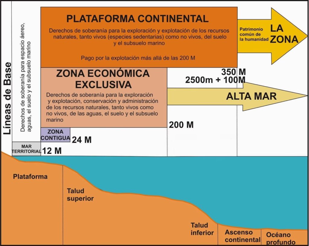 | Zona Económica Exclusiva (ZEE) | Hasta 200 millas náuticas | Derechos soberanos de exploración, explotación, conservación y administración de recursos naturales (pesca, minerales, energía), y otras actividades económicas. | Explotación económica de los recursos marinos y del subsuelo. |