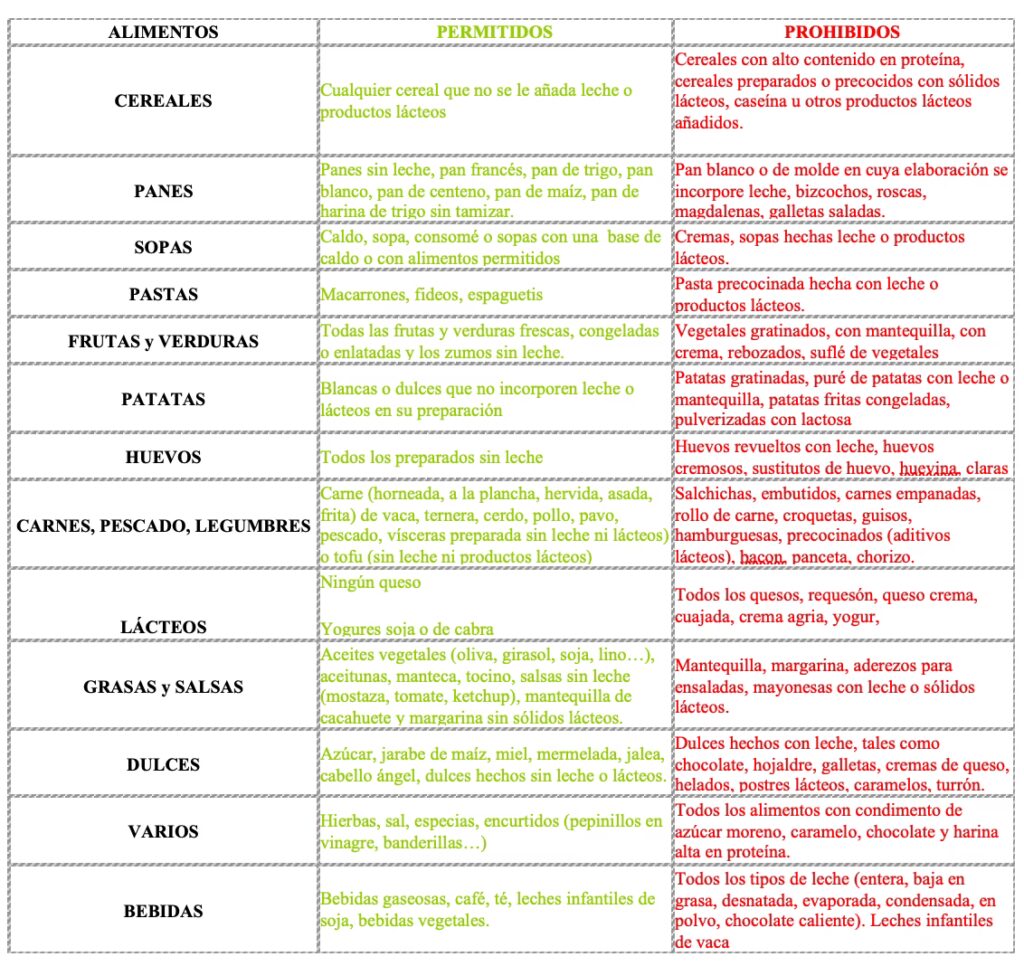 - De Origen Animal (2 o 3 raciones de 30 gramos): Se eliminan leche de vaca, yogur y quesos. Se recomiendan carnes, pescado, aves y huevo.