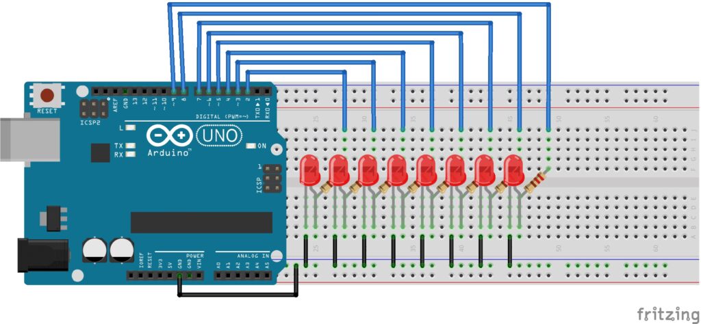 El objetivo es conectar ocho LEDs a los pines digitales de Arduino y programarlos para que realicen diferentes secuencias de encendido y apagado, creando un efecto visual dinámico. Utilizaremos los pines del 2 al 9 como salidas.