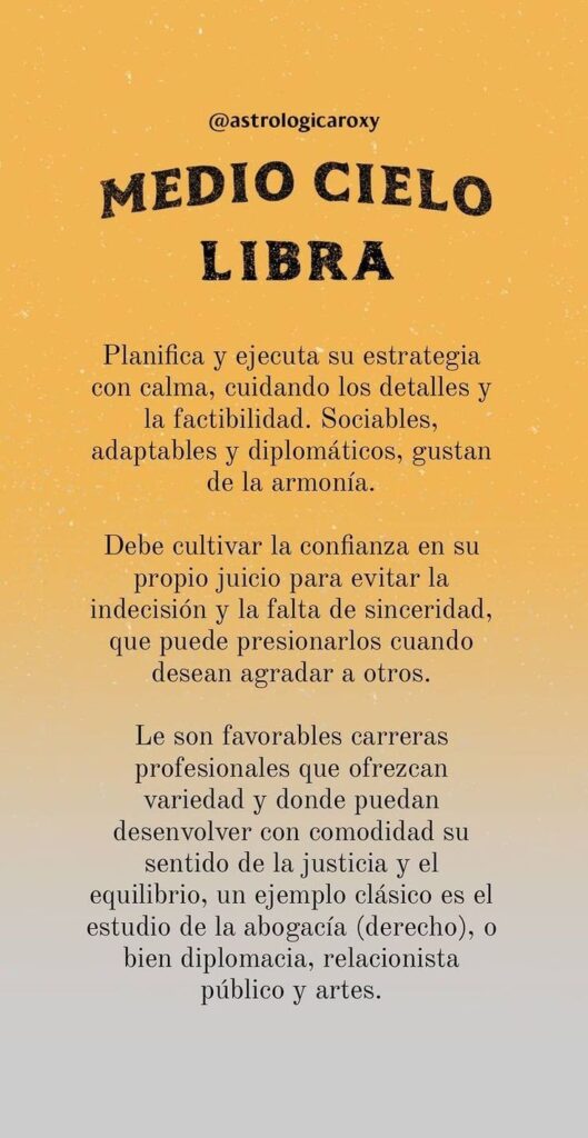 La influencia de Libra en el Medio Cielo dota a los individuos de una habilidad innata para la mediación y las relaciones. No es de extrañar que muchos de ellos se sientan atraídos por carreras en el ámbito de las relaciones públicas, las leyes o la diplomacia, donde su capacidad para conciliar puntos de vista opuestos es invaluable. Su sentido estético y aprecio por la armonía también los impulsa hacia vocaciones artísticas, el diseño, la moda o la música, donde pueden expresar su amor por la belleza en todas sus formas.