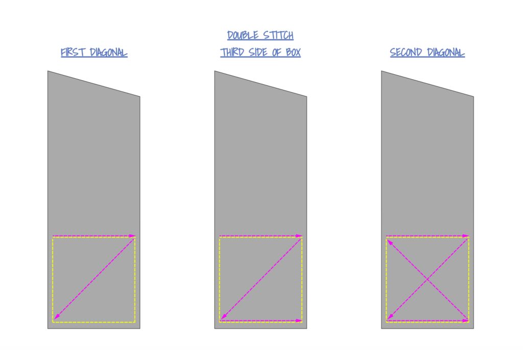 Es importante notar que en la puntada Box X reforzada, las líneas superior e inferior de la caja son las que se cosen dos veces, es decir, se superponen. Las ilustraciones de este tipo de puntada a menudo las muestran ligeramente separadas para que puedas visualizar la dirección, pero en la práctica, se cosen una directamente encima de la otra para crear esa doble capa de hilo que proporciona la resistencia adicional.