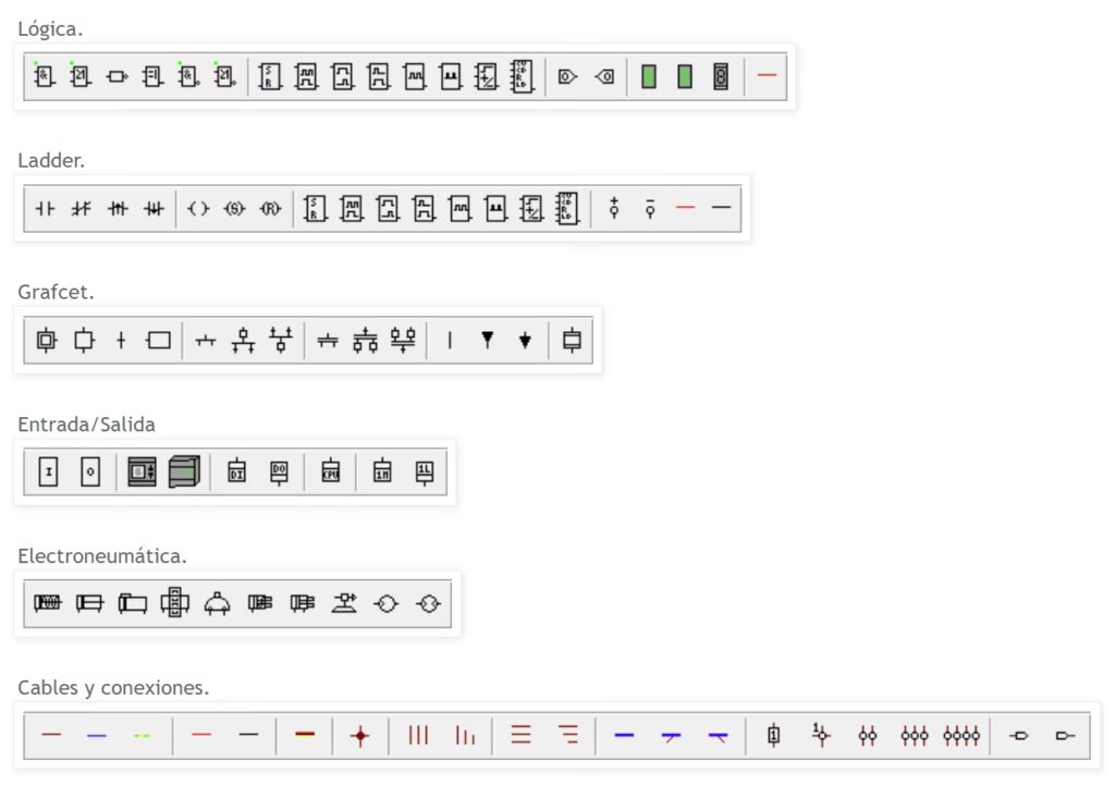 | Lógica (Digital, Ladder, Grafcet) | Elementos para el diseño de circuitos lógicos, incluyendo puertas lógicas, diagramas Ladder (escalera) y diagramas Grafcet para control secuencial. |