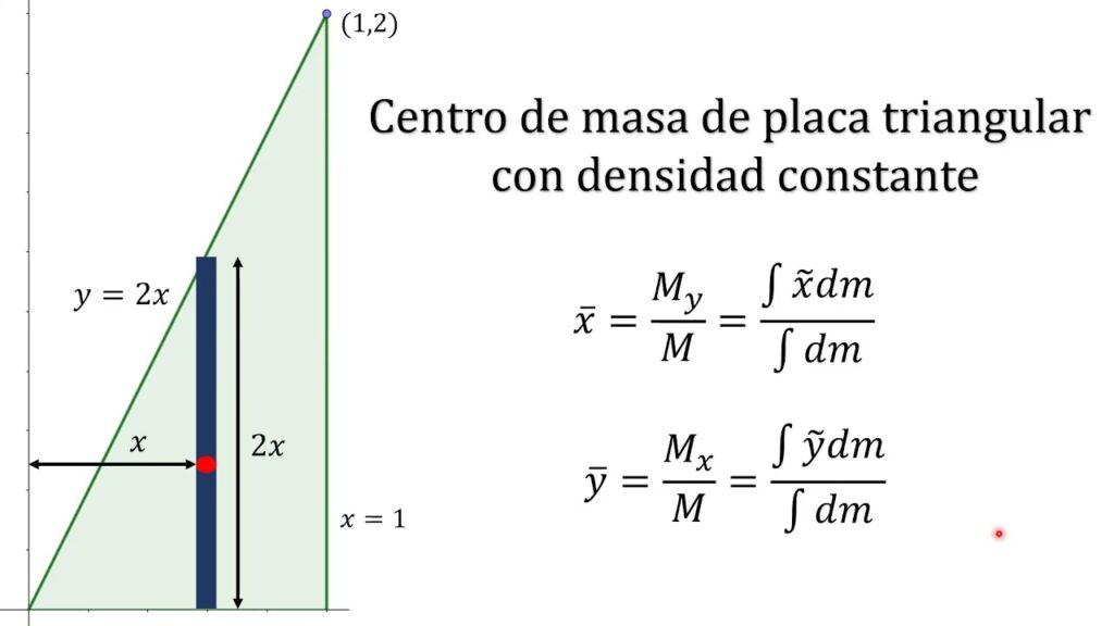 x̄es la coordenada x del centro de masa.xes la variable que representa la posición a lo largo del eje x.ρ(x)es la función de densidad en función de x (masa por unidad de longitud, área o volumen).- Las integrales se toman sobre el dominio del objeto a lo largo del eje x. El denominador representa la masa total del objeto.