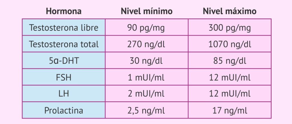 - Para hombres: 50-210 ng/L (174-792 pmol/L).