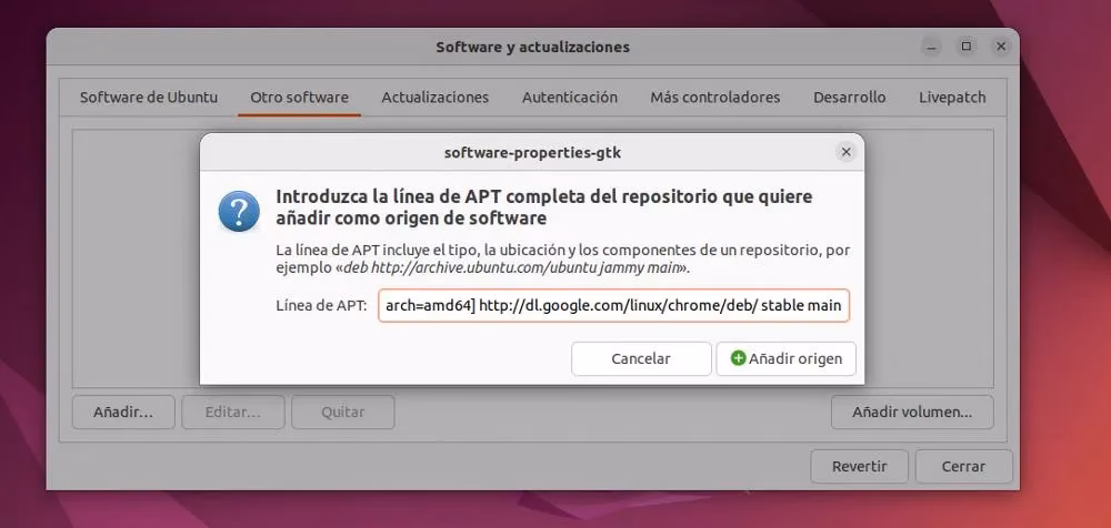 deb http://archive.ubuntu.com/ubuntu/ bionic main). - Haz clic en "Añadir origen". Se te pedirá la contraseña de tu usuario para confirmar la acción.