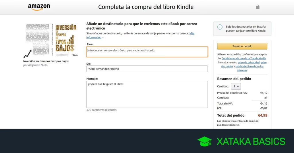 - Para: Aquí puedes introducir la dirección de correo electrónico de la persona a la que deseas regalar el eBook. Si introduces su email, Amazon le enviará directamente el enlace para canjear el libro.