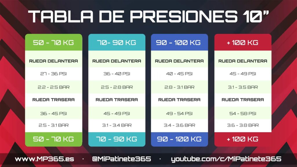 El peso que soporta el patinete es un factor determinante para la presión necesaria. A mayor peso, se requiere una presión ligeramente superior para mantener la forma del neumático, evitar la deformación excesiva y asegurar un rodaje eficiente. Las siguientes recomendaciones están dadas en bares, una unidad de medida común para la presión de neumáticos: