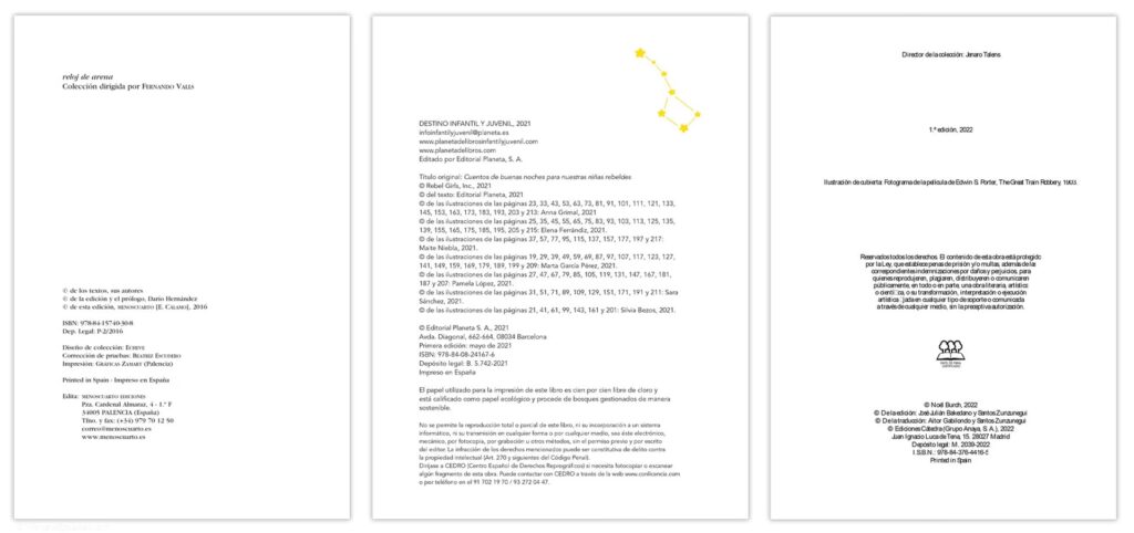 Contiene los datos de la casa editorial que publica el libro: nombre, domicilio social, teléfono de contacto, página web y correo electrónico. En obras traducidas, puede incluirse el pie de imprenta de la editorial original.