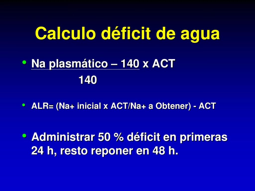 Déficit de agua libre = (Na actual - Na ideal) x F x peso (kg)