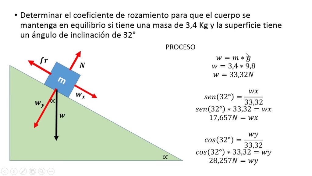 Si el plano inclinado tiene un ángulo θ con la horizontal, la fuerza de peso (vertical) se puede descomponer en dos componentes: una perpendicular al plano (W cos θ) y otra paralela al plano (W sen θ). La fuerza normal será igual en magnitud a la componente perpendicular del peso (en ausencia de otras fuerzas perpendiculares), y la fuerza de fricción actuará paralela al plano, oponiéndose al movimiento o la tendencia de movimiento.