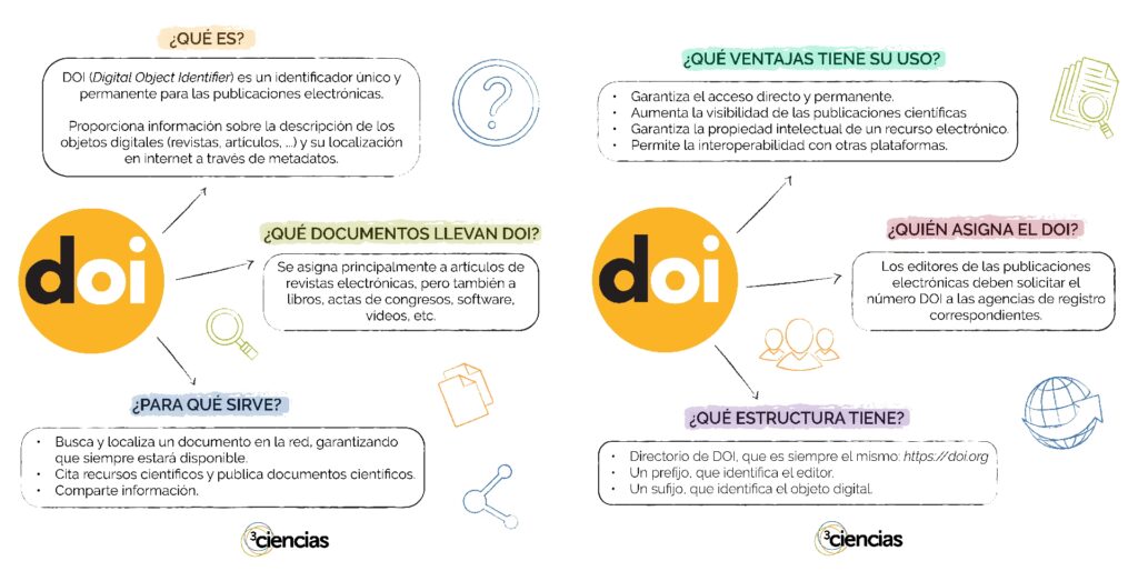 - DOI (Digital Object Identifier): Es un identificador alfanumérico que se asigna a un objeto digital (como un libro electrónico o un capítulo de libro) y su propósito principal es proporcionar un enlace persistente a su ubicación en línea. Su función es la identificación y el acceso continuo a la información en el entorno digital. Un mismo libro electrónico puede tener un ISBN para su identificación comercial y un DOI para su localización persistente en la web.