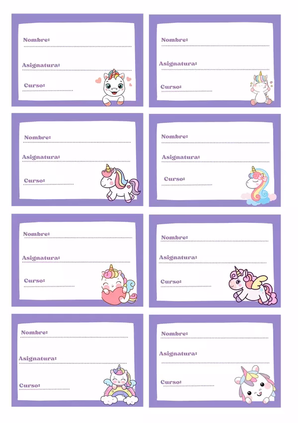 | Etiquetas de Unicornio | Identificación de cuadernos, organización de materiales, detalles de fiesta | Cartulina (180-250 g/m²) | Fomenta la organización, personalización, estética |