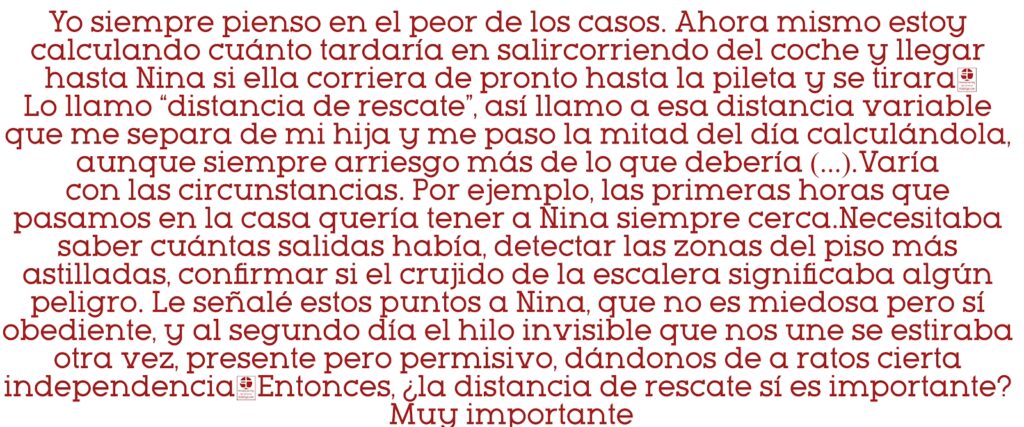 En paralelo a estos relatos, Amanda reflexiona constantemente sobre la “distancia de rescate”: la distancia variable que la separa de su hija Nina, esa medida ideal que le permite estar lo suficientemente cerca para protegerla de cualquier peligro, pero a la vez permitirle cierta libertad. Esta distancia, un hilo invisible que la une a Nina, se vuelve el epicentro de su ansiedad y el medidor de su capacidad de protección. La tensión de este hilo se vuelve palpable a medida que los peligros se ciernen sobre ellas.
