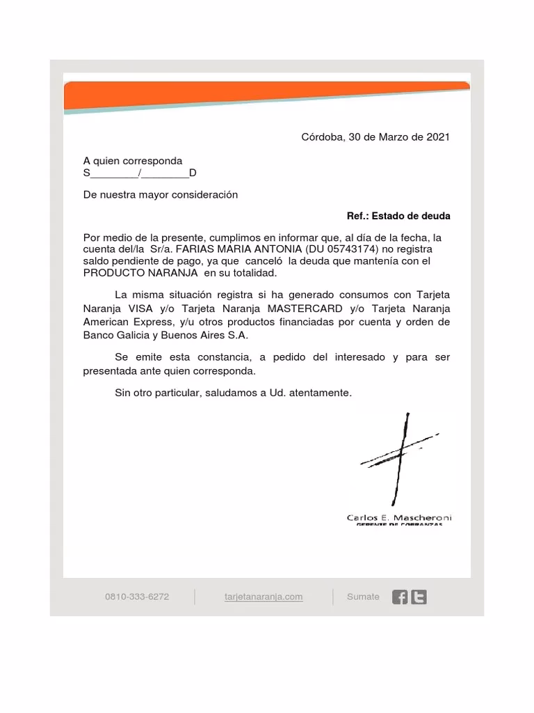 Una vez que hayas saldado por completo tu deuda con Tarjeta Naranja, el siguiente paso es obtener el certificado de libre deuda. Este documento es tu comprobante oficial de que no tienes obligaciones pendientes con la entidad, y es fundamental para tu historial crediticio.