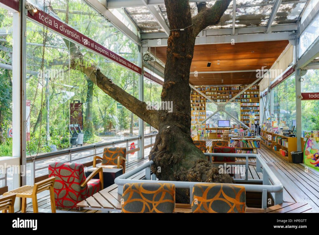 Uno de los elementos más distintivos y cautivadores de su arquitectura es la integración de un majestuoso árbol pirul en su interior. Los ventanales no solo enmarcan su presencia, sino que también proveen un efecto invernadero que contribuye a su conservación, permitiendo que este gigante verde coexista y prospere dentro del espacio de la librería. Esta decisión de diseño no es meramente estética; refleja un compromiso profundo con la conservación del entorno y una filosofía de respeto hacia la biodiversidad. El pirul se convierte en el corazón vivo de la librería, un recordatorio constante de la belleza y la importancia de la naturaleza, y un compañero silencioso para miles de lectores.