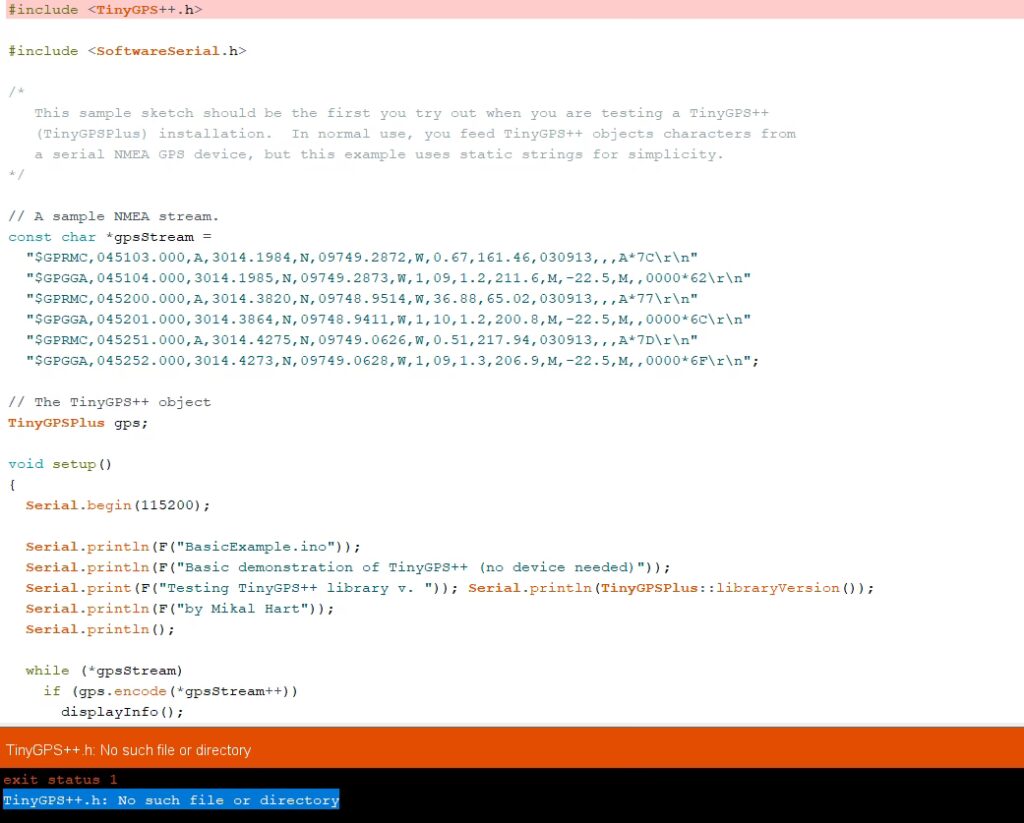 Un error común es cuando las sentencias NMEA se envían a TinyGPS++ de forma incompleta. Esto sucede a menudo si los caracteres del GPS se leen demasiado lento o con poca frecuencia, lo que provoca la pérdida de algunos. El síntoma es fácil de detectar: fallos en la suma de verificación. Cada sentencia NMEA termina con un campo numérico que representa una suma matemática de todos los caracteres. Si este número no coincide con la suma real, TinyGPS++ simplemente descarta la sentencia y aumenta el contador de failedChecksum().