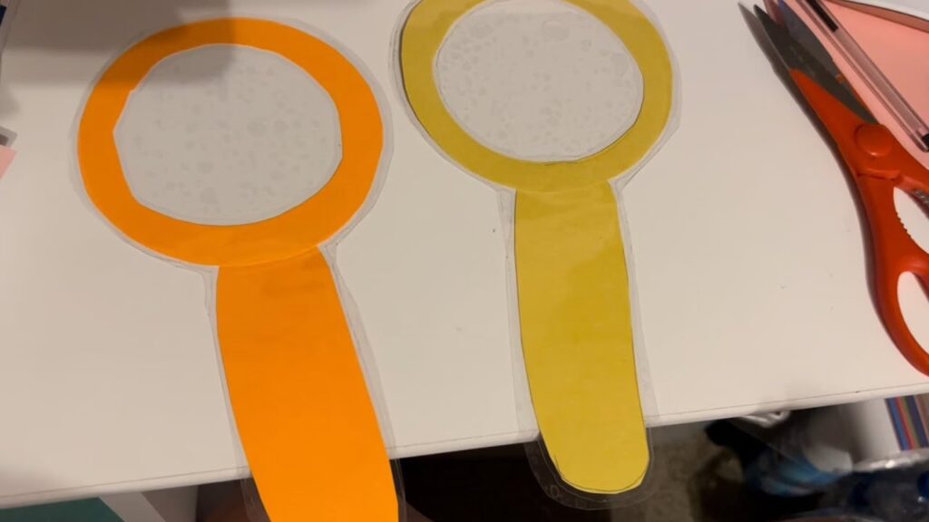 - Toque Final (Opcional): Si quieres darle un aspecto más parecido a una lupa tradicional, puedes pegar un palito pequeño en la parte inferior del círculo de plástico con cinta aislante. Además, para mayor seguridad, puedes cubrir los bordes afilados del plástico con cinta aislante.