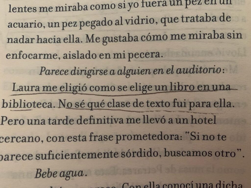 “Me eligió como se elige un libro en una biblioteca. Ignoro si me escogió por el título, el lomo, la portada, la tipografía o por mi ubicación entre otros libros. No sé qué clase de texto fui para ella”.