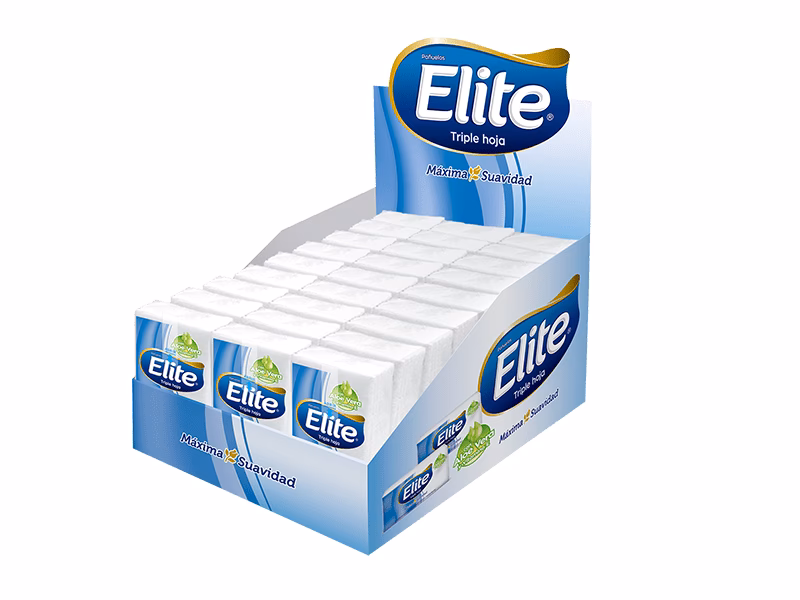 Elite entiende que las necesidades de los consumidores varían, por lo que ofrece una amplia gama de presentaciones para sus pañuelos desechables. Esto asegura que haya un producto Elite adecuado para cada situación y lugar: