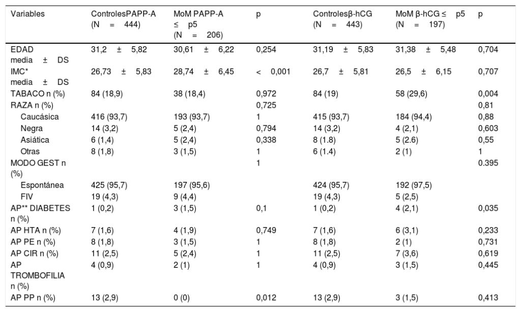 Las gestantes con niveles de PAPP-A y/o beta-hCG libre iguales o inferiores al percentil 5 (MoM ≤ 0,41 para PAPP-A y MoM ≤ 0,43 para beta-hCG) fueron clasificadas como casos. Los hallazgos más significativos incluyeron: