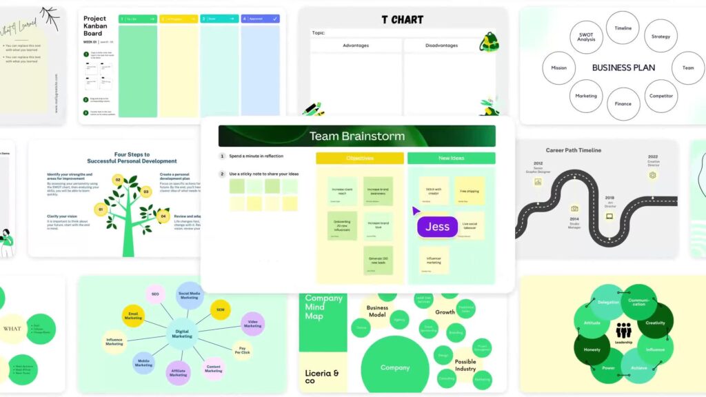 - Plantillas Prediseñadas: Muchas plataformas ofrecen plantillas para lluvia de ideas, mapas mentales, diagramas de flujo, planificación de proyectos (Scrum, Kanban), análisis FODA y mucho más, facilitando el inicio rápido de cualquier actividad.