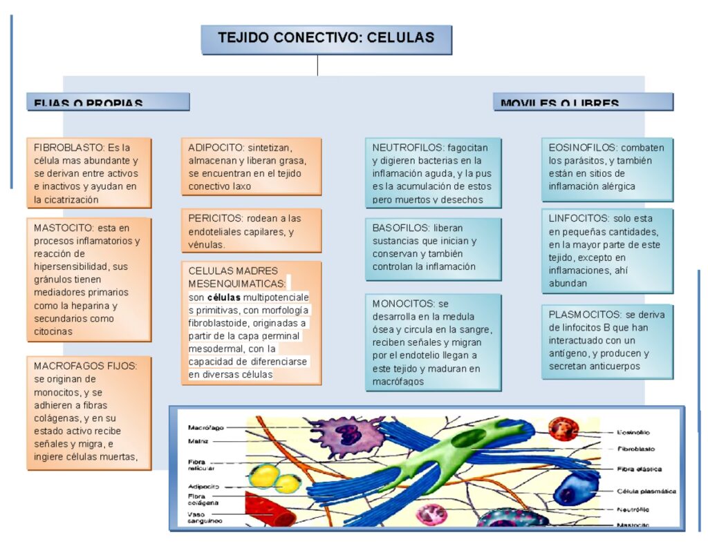 | Función Principal | Síntesis y mantenimiento de la matriz extracelular, almacenamiento. | Defensa inmunitaria, respuesta inflamatoria, fagocitosis. |