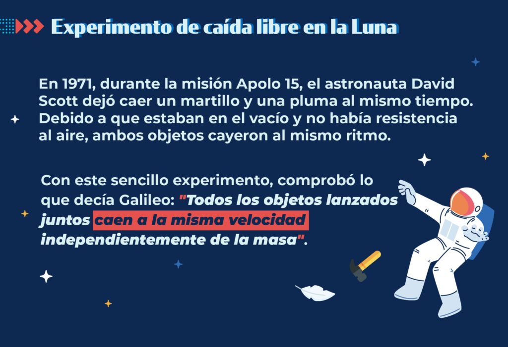 Más allá de la anécdota de Galileo, el experimento de la pluma y el martillo realizado por el astronauta David Scott en la Luna durante la misión Apolo 15 es una demostración icónica de este principio. En la atmósfera casi inexistente de la Luna, Scott dejó caer simultáneamente una pluma y un martillo. Ambos objetos tocaron la superficie lunar al mismo tiempo, proporcionando una prueba visual y empírica contundente de que la aceleración de la caída libre es independiente de la masa.