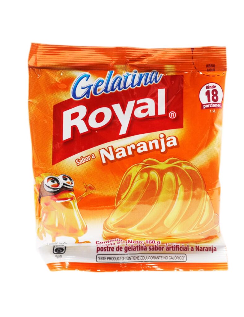 La gelatina Royal es un producto alimenticio premezclado diseñado para facilitar la preparación de postres gelatinosos. Se caracteriza por su composición que incluye gelatina (el agente gelificante principal), una combinación de ácidos como el fumárico para la tartina, y citrato de sodio para controlar la acidez, lo que contribuye a su sabor equilibrado y consistente. Además, incorpora sabores naturales y artificiales que le otorgan su distintiva variedad de gustos, así como edulcorantes como el aspartame y el acesulfamo potasio en sus versiones sin azúcar, y colorantes como el Rojo 40 y el Amarillo 6 para su atractivo visual.