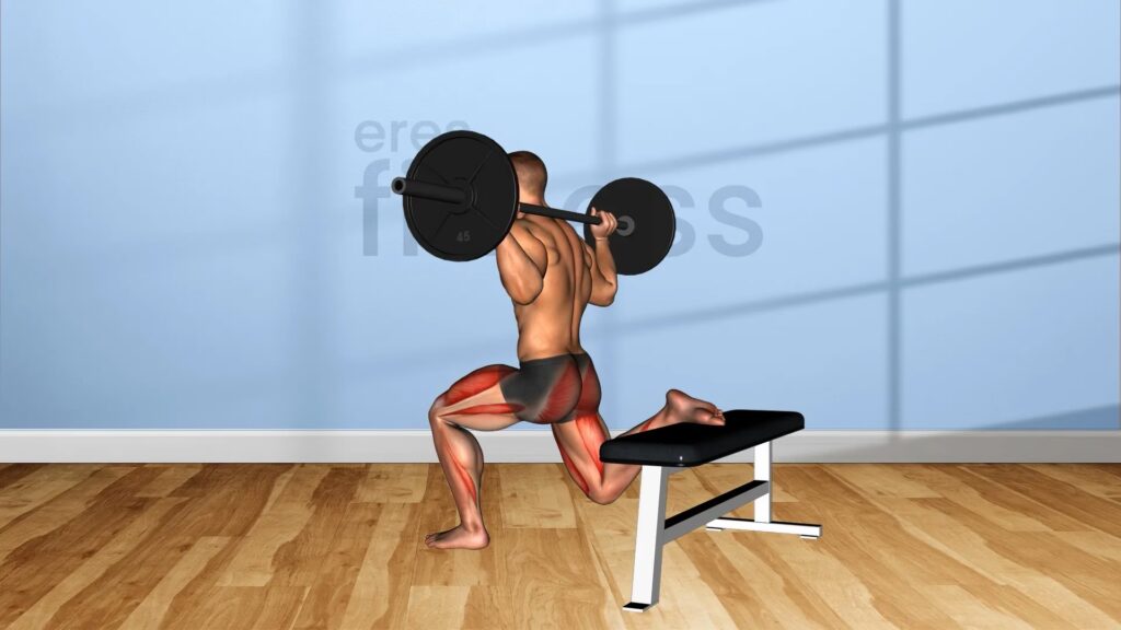 - Sentadilla Búlgara: Una pierna se apoya en un banco trasero. Es un ejercicio unilateral que mejora el equilibrio, la estabilidad y corrige desequilibrios musculares entre ambas piernas. Puede hacerse con mancuernas o barra.