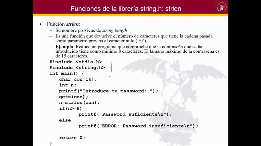 La función strlen() es una de las más utilizadas cuando se trabaja con cadenas de caracteres. Su propósito es simple pero fundamental: devuelve la longitud de una cadena de caracteres, es decir, el número de caracteres que contiene hasta encontrar el carácter nulo de terminación ('\0'). Es importante recordar que el carácter nulo de terminación no se cuenta como parte de la longitud de la cadena.