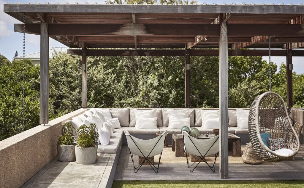 El mimbre, ya sea natural o sintético, es sinónimo de comodidad y ligereza. Sus diseños suelen ser orgánicos y fluidos, perfectos para crear ambientes relajados y bohemios. Combinado con telas en tonos claros o morados, el mimbre puede transformar una terraza en un espacio vibrante y lleno de personalidad. Un patio exterior con pérgola y muebles pintados de blanco, por ejemplo, transmite una sensación de frescura y amplitud, ideal para climas cálidos.