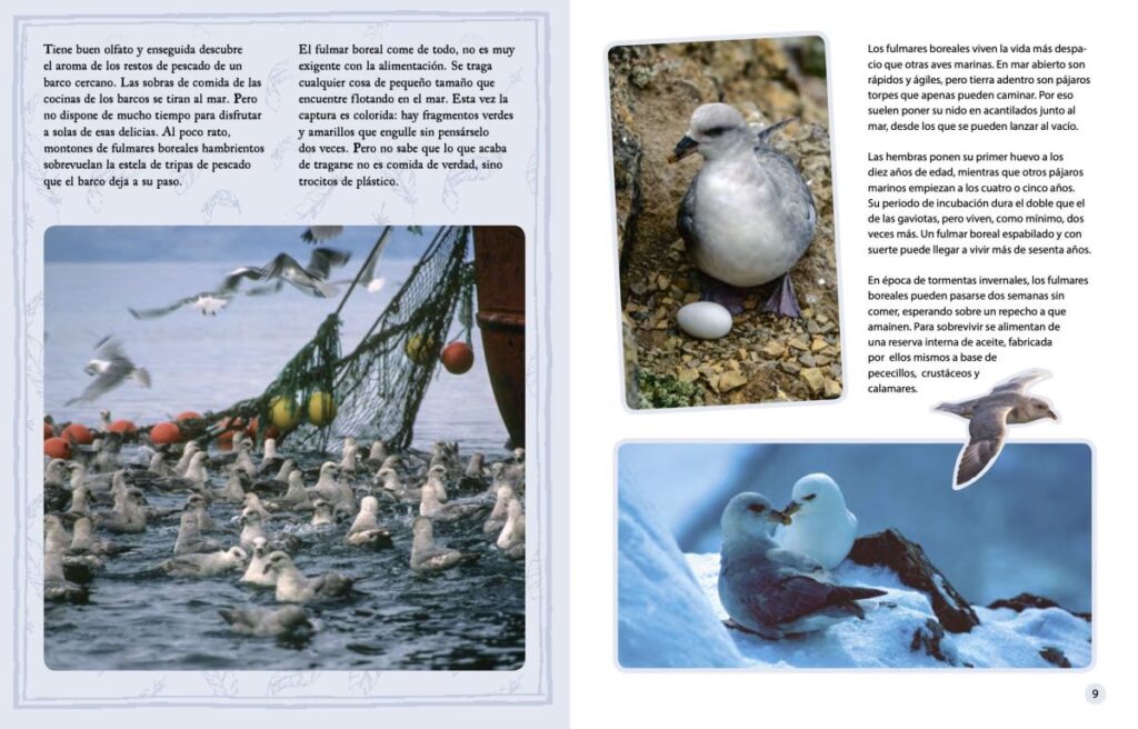 El libro "Un mar de plásticos" profundiza en esta problemática, exponiendo cómo los océanos se están transformando en gigantescos vertederos, con graves repercusiones para la salud de la fauna y flora marinas. A través de la conmovedora historia de un fulmar boreal, un ave marina que habita las costas del Atlántico Norte, el libro ilustra las devastadoras consecuencias del uso masivo e irresponsable del plástico. Este relato sirve como hilo conductor para concienciar sobre la necesidad imperante de limitar drásticamente el empleo de este material.